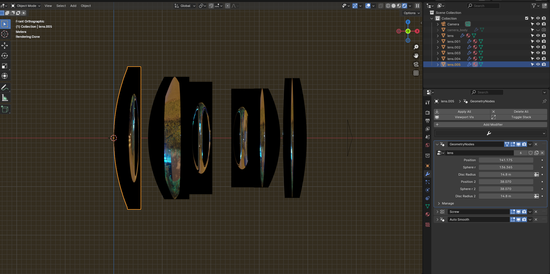 Above is the base geometry node setup for generating a single camera lens within blender. One can use the parameters of camera lenses to generate them within Blender and therefore emulate the look of shooting with such a camera including Bokeh!